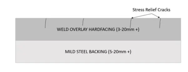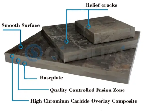| Сильное истирание материала и быстрый износ | 1. Твердость износостойкого слоя (HRC)2. Тип и распределение карбида | 1. Слой сплава высокой твердости (HRC 60+)2. Плотная и равномерная износостойкая структура. | Резка, сварка, крепление болтами |
